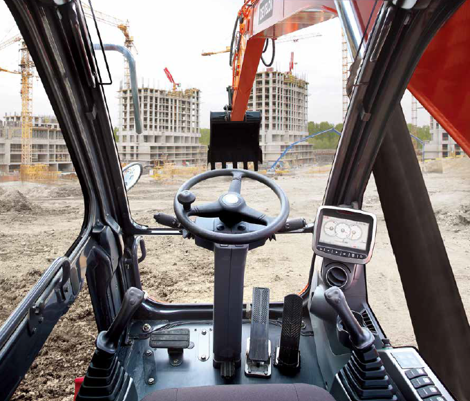 Cabin rộng rãi, cách âm tốt, trang bị hệ thống treo giảm chấn giúp hạn chế rung và tiếng ồn. Ghế hơi tùy chọn sưởi, điều hòa điện tử 5 chế độ và cột lái điều chỉnh giúp người vận hành thoải mái trong mọi điều kiện. Màn hình LCD 7 inch hiển thị đầy đủ trạng thái máy, camera sau và cảnh báo vận hành. Cabin đạt chuẩn ROPS/FOPS kết hợp hệ thống LED, còi cảnh báo và kính khẩn cấp giúp tăng an toàn tuyệt đối.