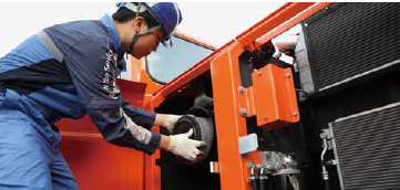 DX210WA được thiết kế thân thiện bảo trì với điểm bơm mỡ tập trung, lọc thủy lực sợi thủy tinh và lọc nhiên liệu đa tầng có tách nước. Lọc gió kép xả bụi tự động giúp bảo vệ động cơ trong môi trường bụi – ẩm. Hệ thống giám sát qua PC kết nối EPOSTM cho phép kiểm tra áp suất, vòng tua và dữ liệu vận hành chính xác. Thùng nhiên liệu 350L và thùng dầu thủy lực 205L giúp máy vận hành liên tục nhiều giờ, giảm thời gian ngừng máy và tối ưu hiệu quả dài hạn.
