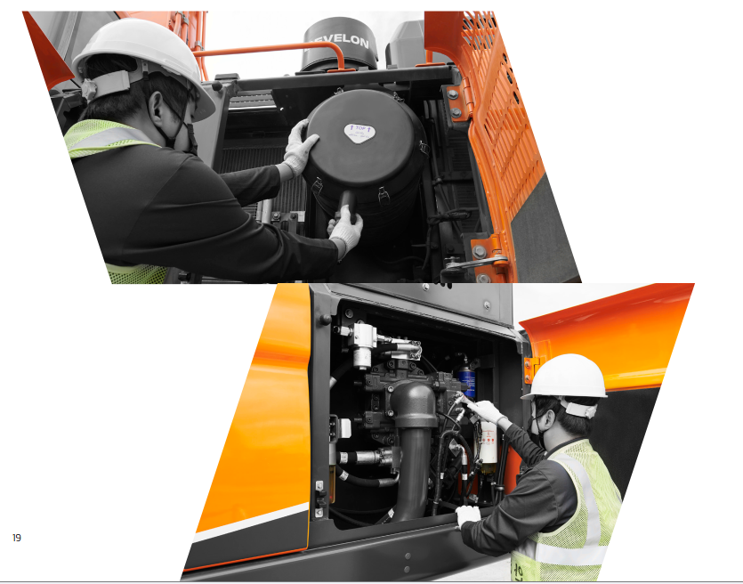 Các vị trí bảo trì chính được bố trí dễ tiếp cận, các điểm bơm mỡ được gom cụm giúp việc bảo dưỡng thường kỳ nhanh và đơn giản. Mạng lưới dịch vụ rộng khắp và hỗ trợ kỹ thuật chuyên nghiệp luôn sẵn sàng. DEVELON CONNECT cung cấp dữ liệu vận hành theo chu kỳ từng giờ cùng nhiều dịch vụ hỗ trợ, giúp bạn tối ưu hóa hiệu suất thiết bị. DEVELON giúp bạn khai thác tối đa thời gian làm việc.
