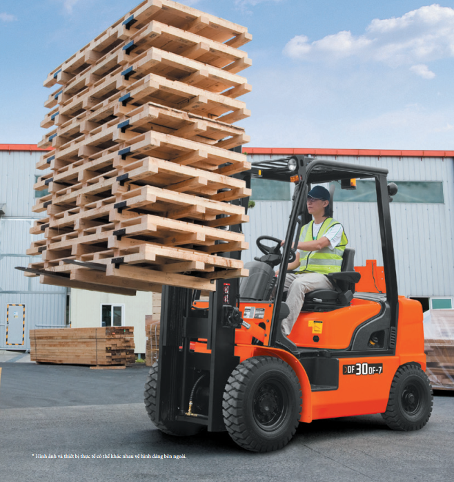 Với tải trọng nâng 3.000 kg tại tâm tải 500mm, 30DF-7 đáp ứng tốt các nhu cầu nâng hạ phổ biến trong kho hàng tiêu chuẩn. Chiều cao nâng tối đa 3.000 mm cho phép xe làm việc linh hoạt với hệ thống kệ phổ thông, phù hợp cho cả kho trong nhà lẫn khu vực bãi ngoài trời. Đây là mức cấu hình rất “thực tế”, hướng tới đa số doanh nghiệp vừa và lớn đang tìm kiếm một mẫu xe nâng diesel bền bỉ, dễ vận hành và ít phát sinh chi phí.